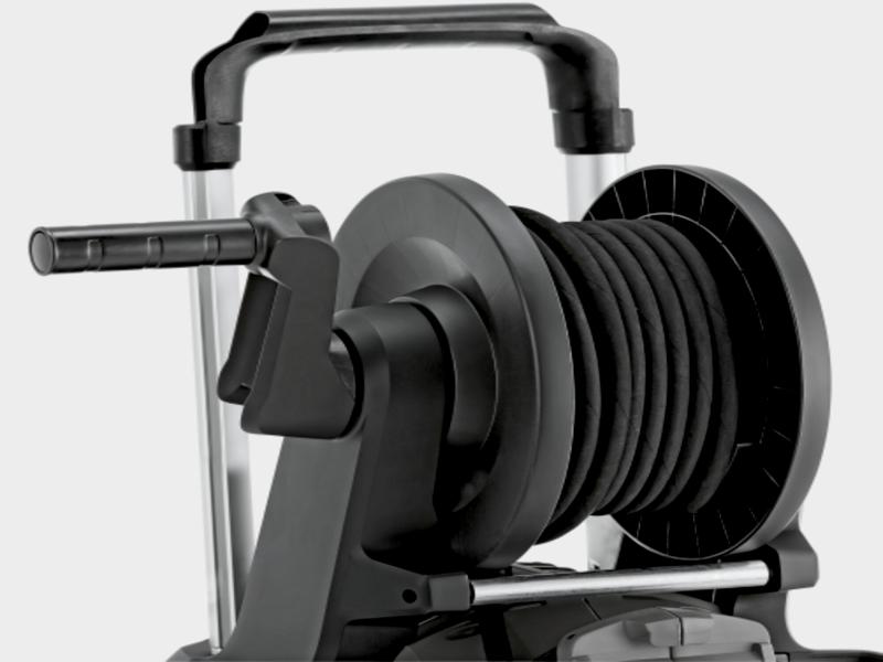 - De geïntegreerde slanghaspel zorgt voor maximaal gebruiksgemak bij het hanteren van de hogedrukslang. Dit maakt snel op- en afrollen mogelijk, verkort de voorbereidingstijd en verhoogt de veiligheid door struikelgevaar te verminderen.