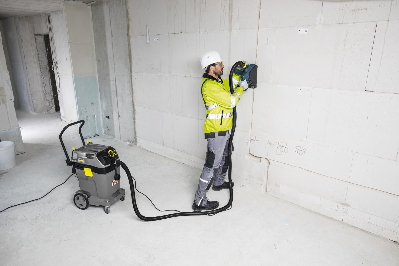 Dankzij de nieuwe volautomatische filterreiniging verwijdert onze stof-/waterzuiger 50/1 Tact Te M ongekend grote hoeveelheden fijnstof en biedt hij tegelijkertijd een gegarandeerde filtratie-efficiëntie van 99,9 procent. Met behulp van sensorgestuurde elektronica zorgt het apparaat altijd voor een optimale filterreiniging en daarmee voor een constant hoog zuigvermogen. In combinatie met het grote en robuuste 50-liter reservoir met metalen zwenkwielen en verstelbare duwbeugel kan het apparaat zo behalve zeer grote hoeveelheden schadelijk fijnstof van stofklasse M ook grof vuil en vloeistoffen aan. De NT 50/1 Tact Te M is voorzien van een stopcontact met automatische in-/uitschakelfunctie, evenals een volledig antistatisch systeem inclusief geleidende toebehoren. Het apparaat is daarom bijzonder geschikt voor directe afzuiging bij elektrische werktuigen die veel fijnstof produceren. Stof dat zich al op de vloer of op machines heeft afgezet, wordt veilig opgezogen met de volledig nieuw ontwikkelde toebehorenset bestaande uit een 4 meter lange zuigslang, roestvrijstalen zuigbuizen en de brede vloerzuigmond. Alle toebehoren zijn dankzij doordachte opbergoplossingen veilig opgeborgen op het apparaat.