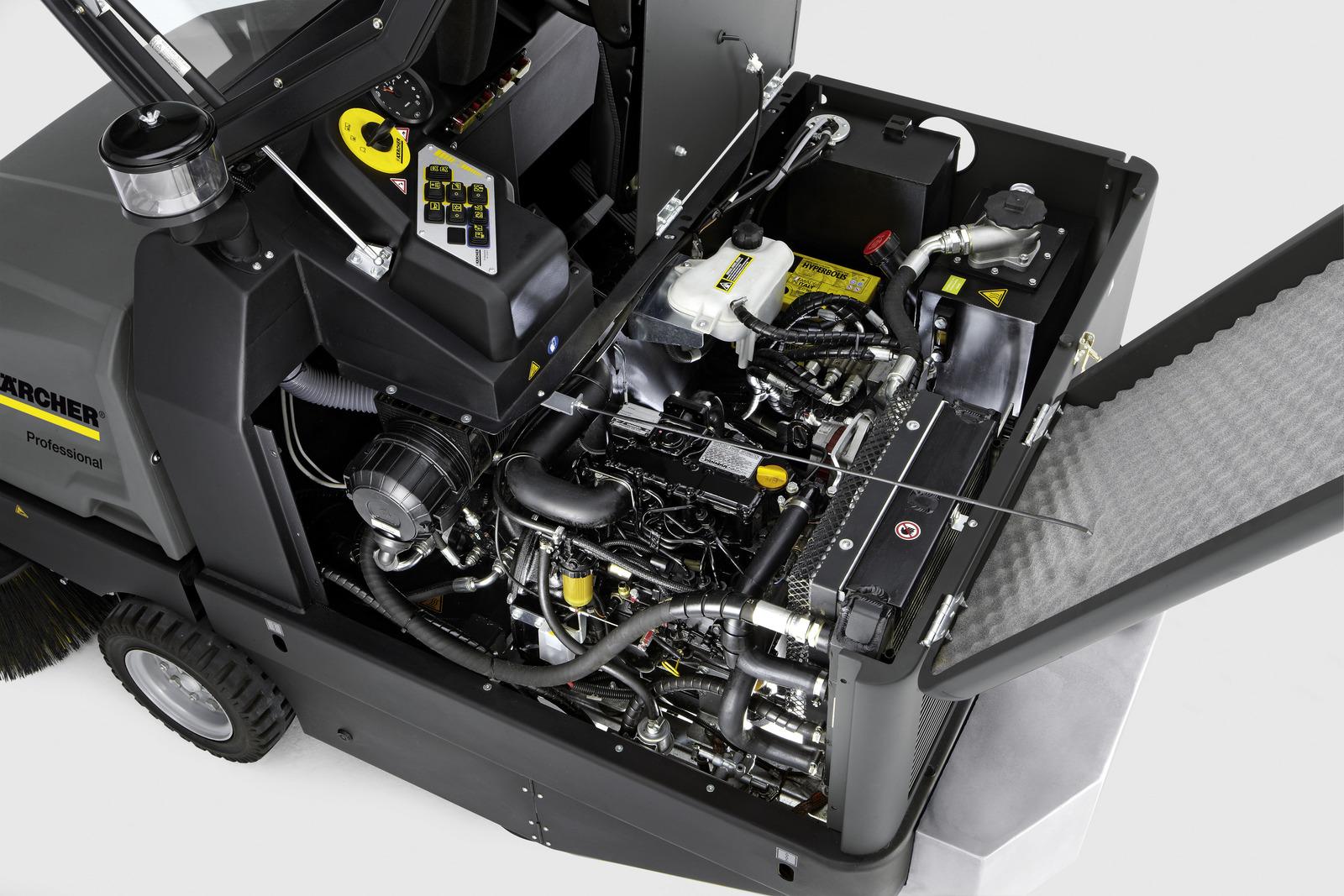 De KM 130/300 R D industriële veeg-/zuigmachine met dieselaandrijving is heel zuinig en valt op dankzij zijn uitstekende rijprestaties. Deze robuuste machine is geschikt voor extreme toepassingen, bv. in de sector van de bouwmaterialen en metaalbewerking of metaalgieterijen en alle andere sectoren met veel vuil. Dankzij het stoffer-en-blikprincipe kunnen fijn stof en grof vuil betrouwbaar worden opgezogen. De walsborstel past zich automatisch aan een oneffen ondergrond aan en het innovatieve veegsysteem beperkt de slijtage tot een minimum. De hoofdwalsborstel kan gemakkelijk zonder gereedschap worden vervangen. Het vuilreservoir wordt automatisch gesloten tijdens het transport. Twee horizontale vlakfilters zorgen voor zuivere lucht, zelfs in omstandigheden met veel stof. De filterreiniging gebeurt met een druk op een knop door een uiterst doeltreffende dubbele krabber. Het filter is bijzonder toegankelijk en kan gemakkelijk zonder gereedschap worden vervangen. De motor is ook heel goed bereikbaar. De basisfuncties kunnen probleemloos worden geselecteerd met een bedieningselement dankzij EASY Operation. Een cycloonfilter reinigt de lucht voordat deze in de motor terechtkomt en verlengt de gebruiksduur aanzienlijk.