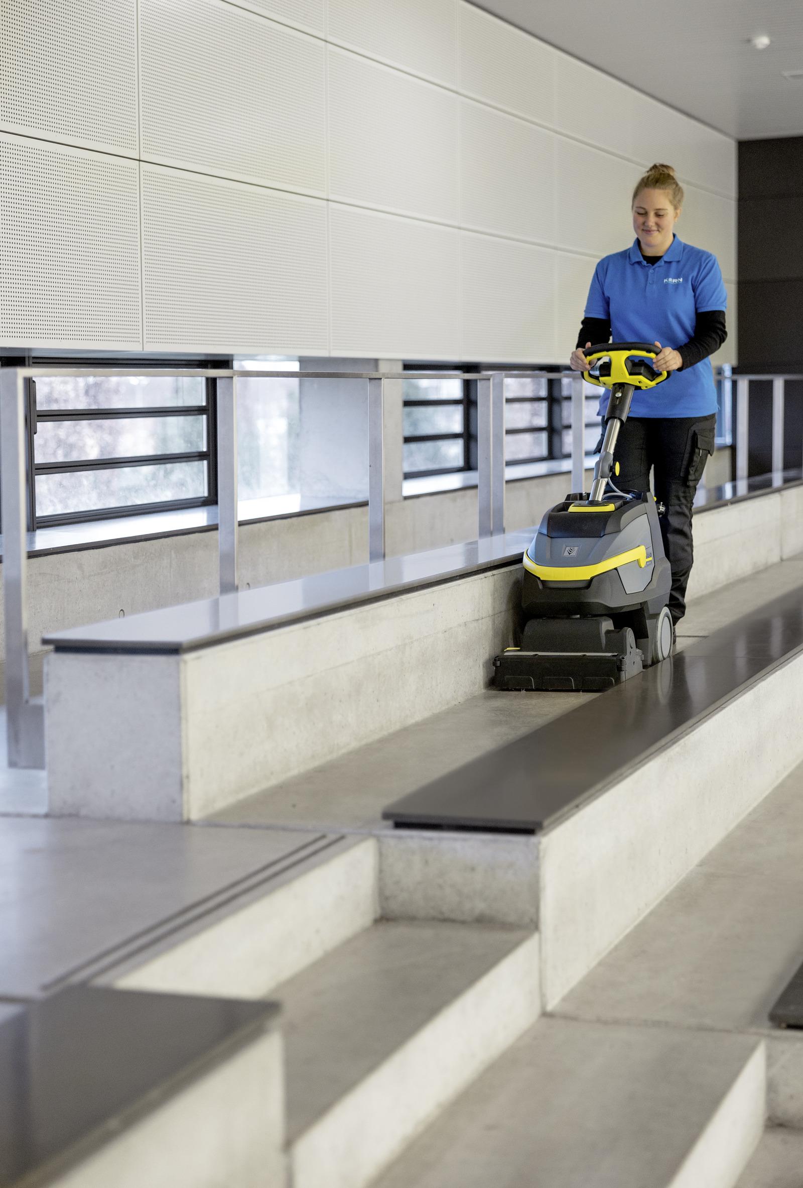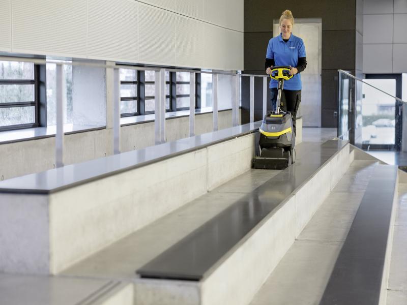 - De machine reinigt zowel vooruit als achteruit en is dankzij het lage gewicht eenvoudig te vervoeren. Daardoor is hij ook zeer geschikt voor gebruik op trappen, drempels en bordessen.